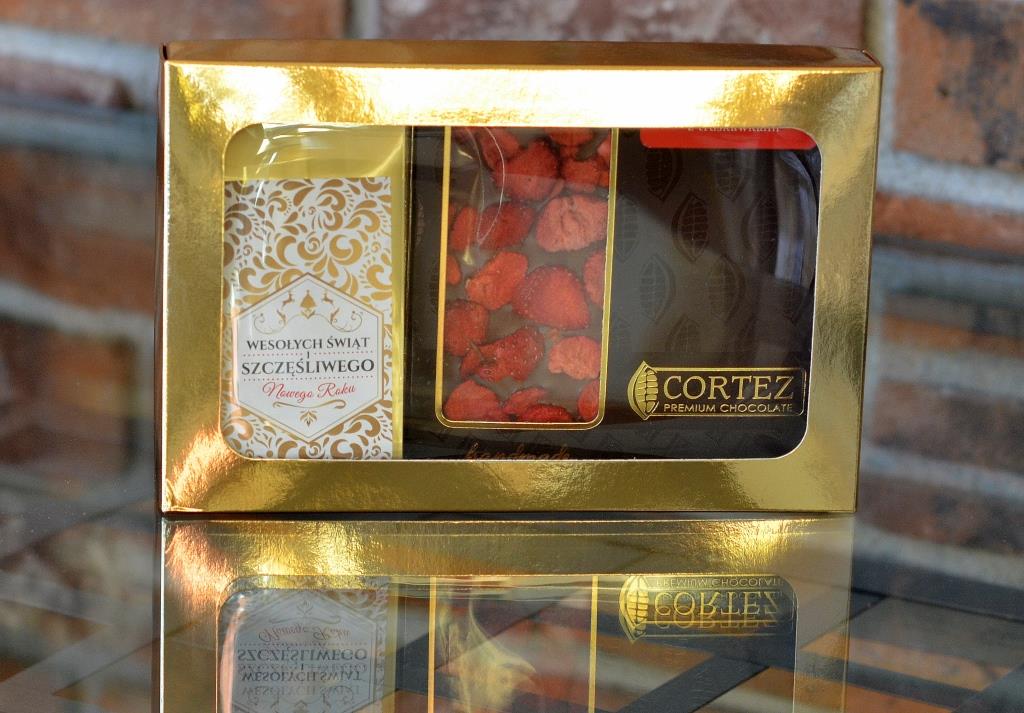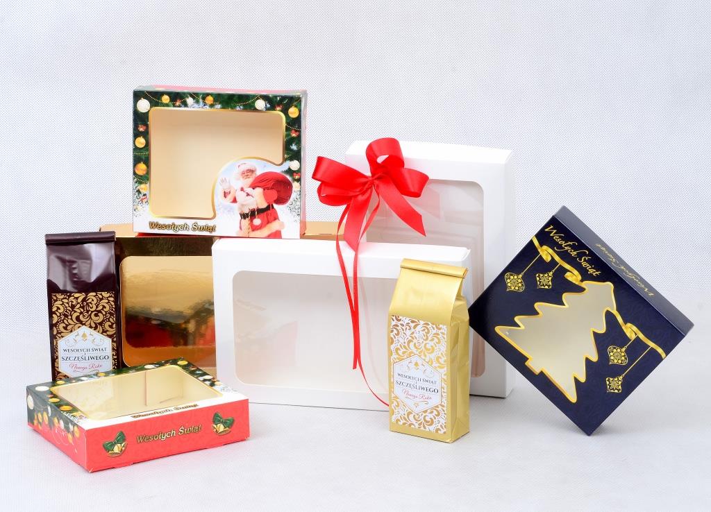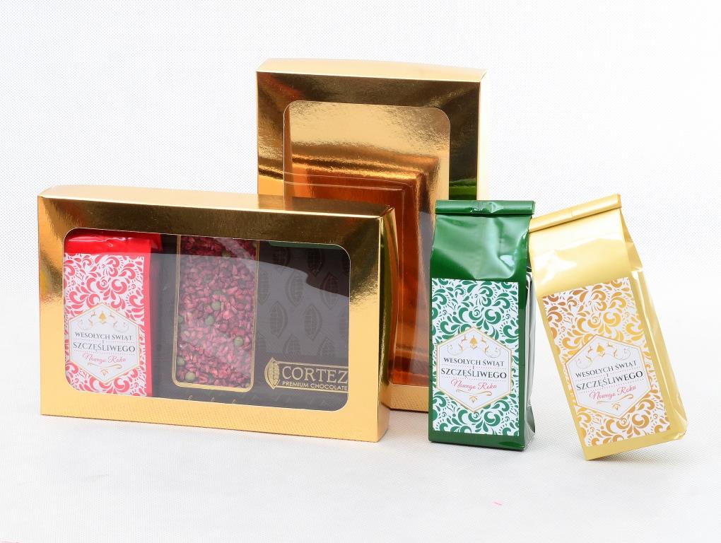 Złote pudełko prezentowe o wymiarach 200 mm x 130 mm x 35 mm.  Składa się z trzech części: wieczka z okienkiem, spodu i wkładki. Idealne do pakowania drobnych prezentów – herbata, kawa, słodycze.  Zdjęcie poglądowe, marketingowe obrazuje przykłady zastosowań pudełka.  Cena netto za 1 szt. obejmuje tylko pudełko bez pozostałych towarów i ozdób pokazanych na zdjęciach.